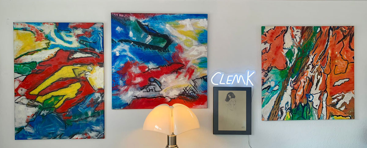 ClemK muss selber lächeln, wenn er sich als „Atavisten“ bezeichnet. Aber gerade in Zeiten von künstlicher Intelligenz und zunehmender Übertechnologisierung unserer überschäumenden Welt, sieht er sich als farbenfrohe Gegenbewegung. Keine Abkehr vom Fortschritt, aber von wildem Wachstum statt Konsolidierung. Das provoziert seine atavistischen Reflexe. In abstrakten Ausdrucksformen findet er eine unmittelbare Verbindung zu unseren Urinstinkten und Emotionen.