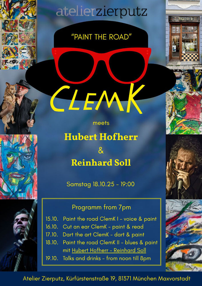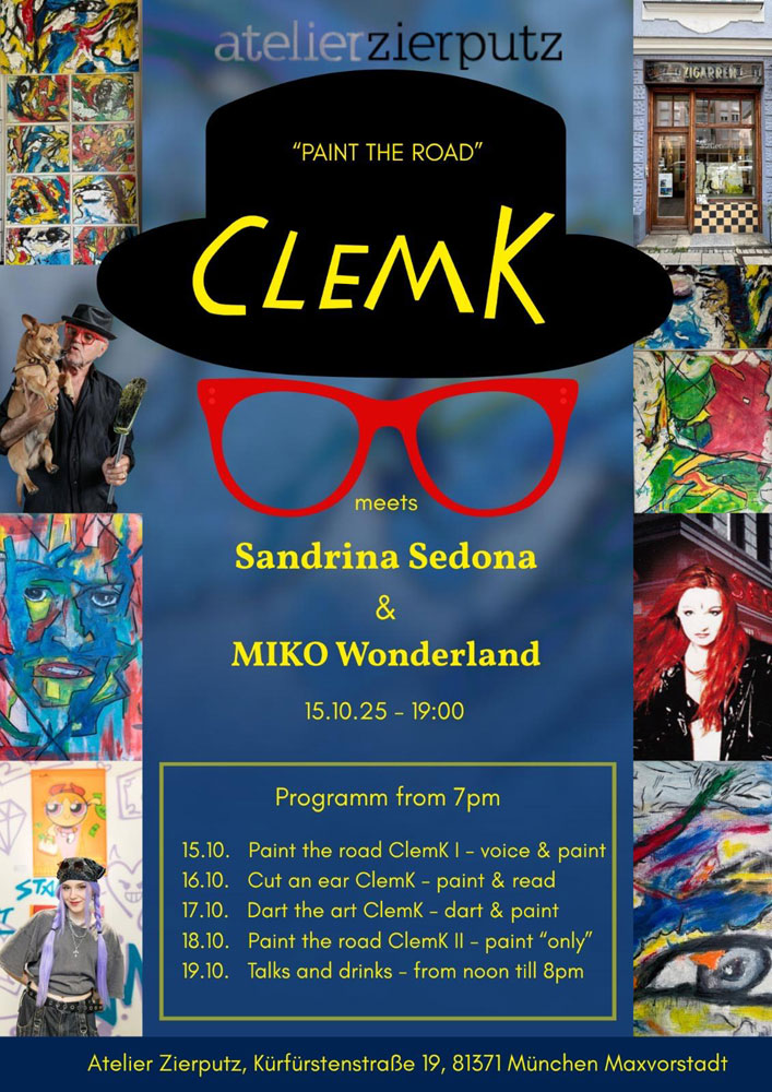ClemK - Painter, author, Theater- and Filmdirector. ClemK was drawn to Rome at a young age as a volunteer for the Italowestern. Here he proved himself to be a valued painter during breaks in filming. Even today, this time shimmers in his portraits as if through an atavistic veil.